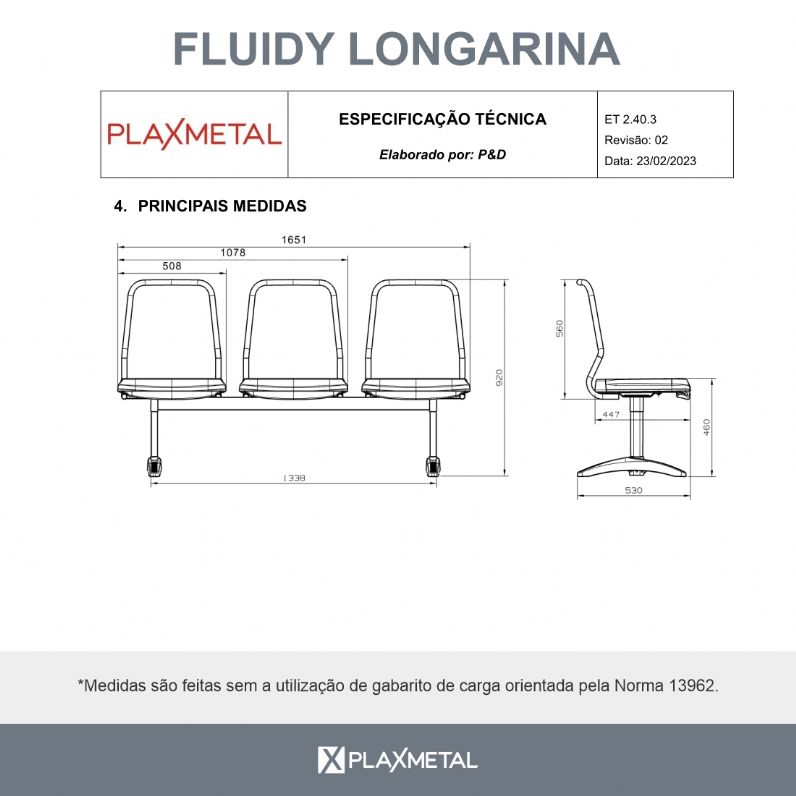 - Longarina Executiva de 3 Lugares - Sem Braços - Modelo Fluidy - Plaxmetal
