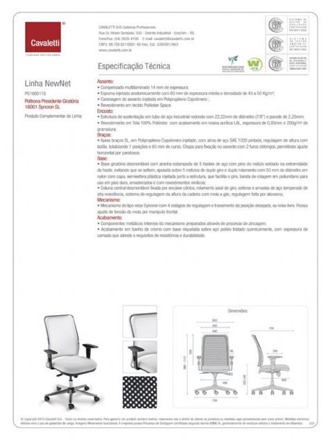 - Os produtos Cavaletti atendem aos requisitos das normas NR17 - Norma regulamentadora do ministerio do trabalho, que trata da ergonomia e da ABNT - NBR 13962 da Associação Brasileira de Normas Técnicas (ABNT), que normatiza os móveis e cadeiras para escritório, características físicas e dimensionais para se obter o melhor conjunto em termos de conforto, ergonomia e durabilidade.
