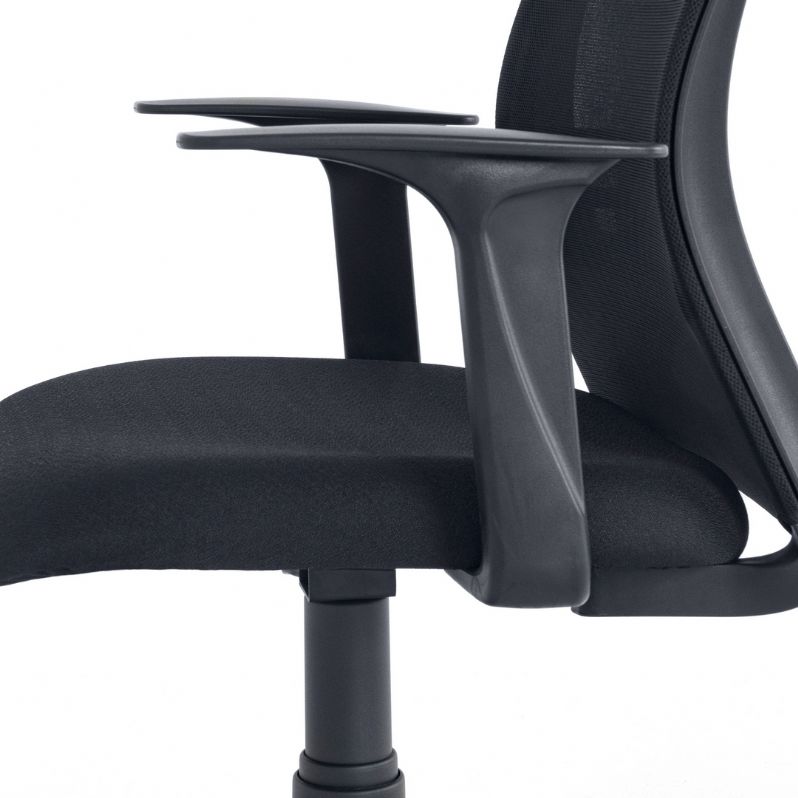 Assento em espuma injetada revestido em tecido a definir, com braços fixos, mecanismo que permite a regulagem de altura da cadeira e o giro no eixo, sua base e rodízios são em nylon.
