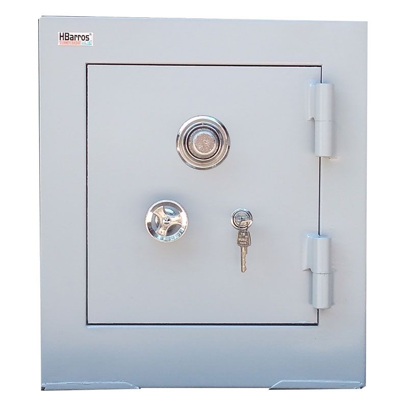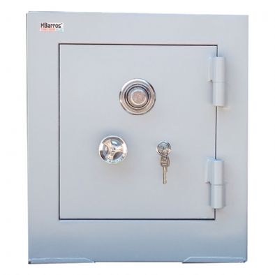 - Paredes do cofre de espessura 50mm em todos as faces, exceto na base que possui espessura média de 7cm. Dobradiças em forma de gonzos com 23mm de espessura, permitindo a porta ser retirada quando totalmente aberta.